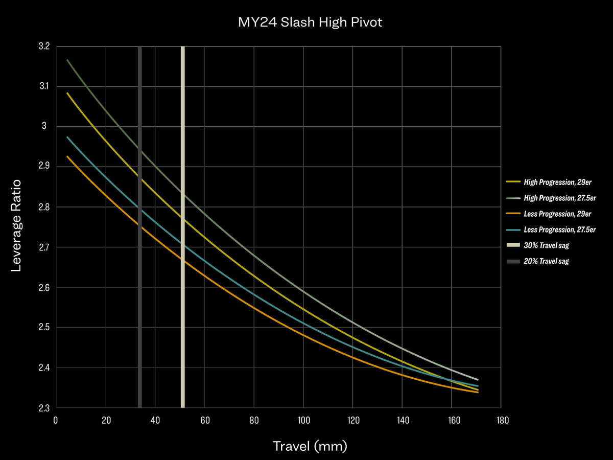 The main ingredient in Slash's pedaling alchemy is its anti-squat curve. Anti-squat is affected by a few variables, but one of the biggest factors is main pivot position. The size and placement of the upper idler gives us another way to tune the anti-squat curve. Between the upper and lower idler layout and size, Slash delivers a super-efficient and super-consistent feeling anti-squat curve that makes this bike pedal more like the short-travel Top Fuel than the previous generation Slash.
